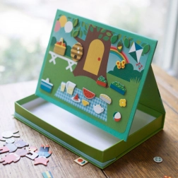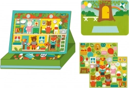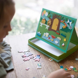 Maak je eigen verhalen met een leuke magnetische set met twee achtergronden en meer dan 72 magnetische stukjes. De draagbare doos in ezel-stijl met stabiele constructie en elastische band voor snel opruimen zorgt voor eenvoudig gebruik thuis en onderweg. Het speelgoed stimuleert creativiteit, fijne motoriek en vrij spel, is gemaakt van gerecyclede materialen bedrukt met plantaardige inkten en voldoet aan alle veiligheidsnormen.