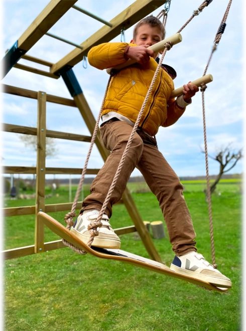 Deze unieke schommel combineert plezier met motorische ontwikkeling. De plank van stevig multiplex met opstaande randen en de verstelbare handgrepen van massief hout laten kinderen veilig balans, coördinatie en stabiliteit trainen. Dankzij het antislopoppervlak is staand schommelen zekerder en comfortabeler.