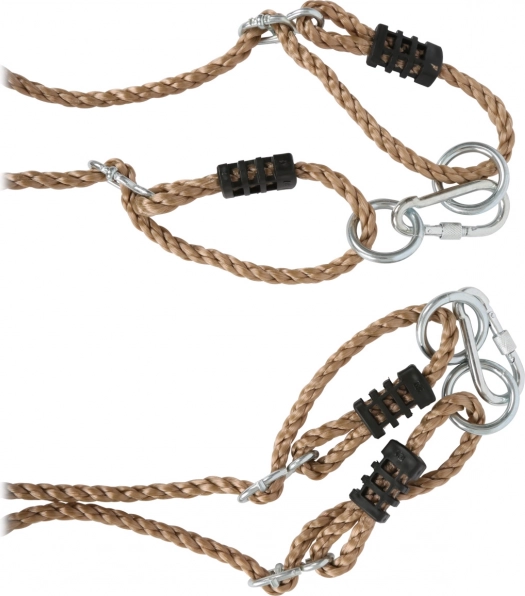 Nylontouwen met metalen doorvoeren, ringen en veiligheidskarabiners zorgen voor een snelle, stevige en veilige ophanging.