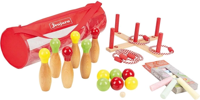 Jeujura buitenspelenset is ideaal voor elke speeltuin. In deze praktische set vind je alles wat nodig is voor leuke spellen zoals hinkelen of kegelen. Alles is gemaakt van hoogwaardig hout en watergedragen verven, wat veiligheid en duurzaamheid garandeert.