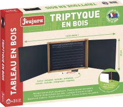 Stijlvol drievoudig wandbord van massief hout dat zowel kinderen als volwassenen ruimte biedt voor creativiteit en leren. Combineert een zwart krijtbord en een wit bord voor markers, heeft een gelijnd middendeel met voorbeelden van schrijfschrift voor eenvoudig oefenen, een magnetische functie en een praktische afleggoot. In de verpakking zitten krijtjes, een marker en een spons. Gemaakt in Frankrijk van hoogwaardig beuken- en grenenhout met waterverdunbare verven en lakken.