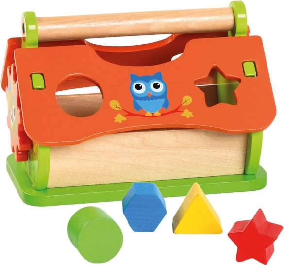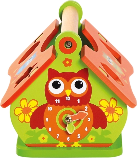 Ontdek de veelzijdige houten inlegpuzzel in de vorm van een huisje, die de verbeelding en vaardigheden van kinderen stimuleert. Dankzij het openklapbare dak, de klok met uil en de kleurrijke vormen ondersteunt het de fijne motoriek, het herkennen van vormen en kleuren en de tijdsoriëntatie. De robuuste houtafwerking en de praktische handgreep zorgen voor veilig spel en eenvoudig meenemen.