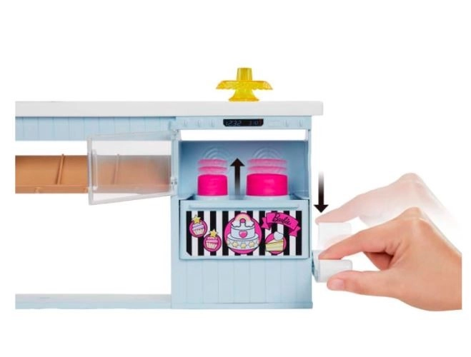 De set bevat een kleinere BARBIE bakker-pop in gestreepte jurk met schort, die geselecteerde accessoires kan vasthouden voor nog realistischer spel. Kleuren en versieringen kunnen variëren. De pop kan niet zelfstandig staan.