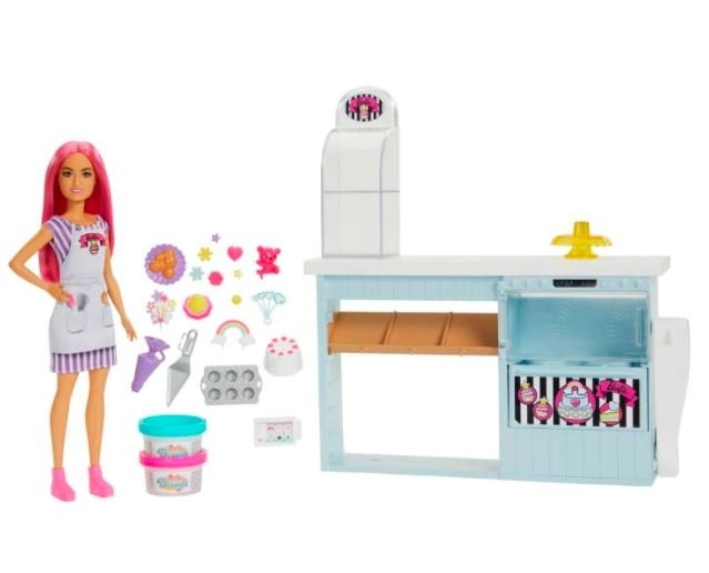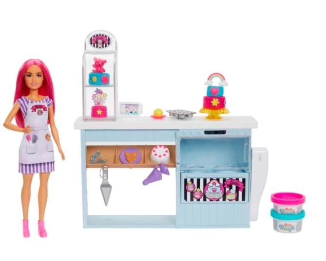 De BARBIE banketbakkerij verandert de kinderkamer in een heerlijk geurende bakkerij. Het driezonige station (bakken – versieren – uitstallen) stimuleert creativiteit en rollenspel. Twee kleuren boetseerdeeg laten kinderen taartjes en koekjes maken die “omhoog komen” zodra je aan de hendel in de oven trekt, waarna ze op de standaard kunnen worden versierd.