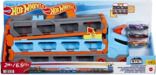 Beleef de spanning van een razendsnelle race! Dankzij de hendel aan het einde van de baan kan de eerste auto de race finishen, terwijl de tweede stopt. De race-transporter is te koppelen aan andere Hot Wheels City-speelsets (apart verkrijgbaar), zodat je je eigen racetraject kunt creëren.