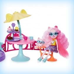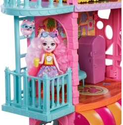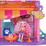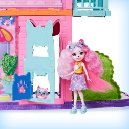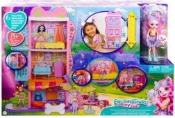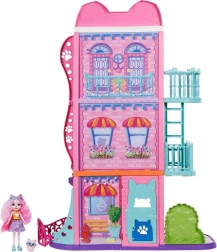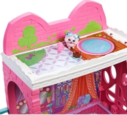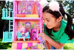 Ontdek stedelijke avonturen met het ENCHANTIMALS huis, dat tot 6 speelzones in één stijlvolle set biedt. Kinderen kunnen gasten bedienen in het knusse café met patio, relaxen in de woonkamer met keuken, de pop naar bed brengen in de slaapkamer en plezier maken in het zwembad op het dak. Realistische elementen zoals het balkon, de brandtrap en de openslaande deur met klep voor hondje Pommy stimuleren roleplay en de fantasie.