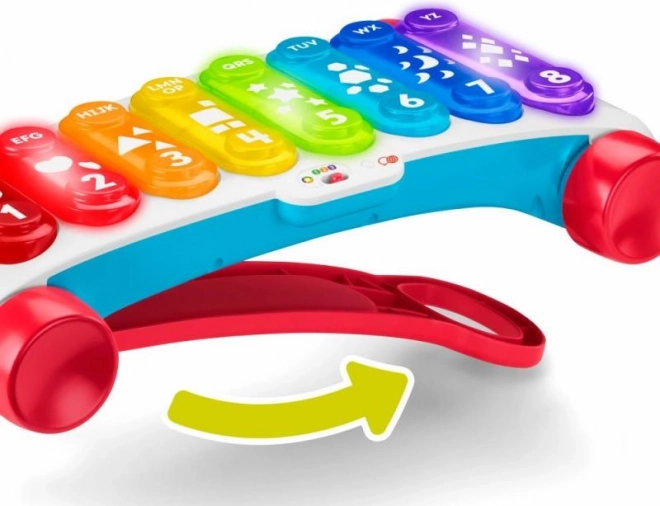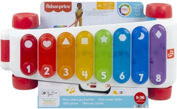 De grote educatieve xylofoon van Fisher-Price is een nieuwe versie van het klassieke trek-speelgoed, nu met nog meer plezier! Deze extra grote interactieve xylofoon heeft 8 verlichte toetsen die meer dan 60 geluidsactiveringen starten, waaronder verschillende geluiden, liedjes en zinnen. Het speelgoed is voorzien van een stevige, inklapbare hendel, zodat kleine muzikanten zowel zittend kunnen spelen als met de xylofoon kunnen rondlopen. Dankzij de Leer­niveaus-technologie kan de speelwijze worden aangepast naarmate het kind groeit. Educatieve zinnetjes en liedjes leren onder meer het alfabet, cijfers en vormen, maar ook eenvoudige woorden in het Engels. Druk op de wereldbolknop om de taal te kiezen: Tsjechisch, Pools, Hongaars, Slowaaks of Engels.