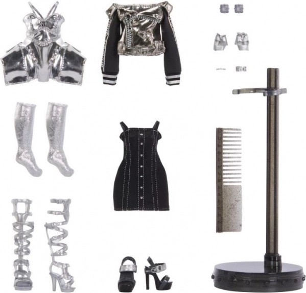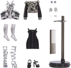 Inbegrepen is een stijlvolle outfit in tinten grijs, zwart en zilver, aangevuld met schoenen, sieraden en een standaard. De uitgebreide set accessoires stimuleert fantasierijk spel, het mixen van stijlen en een verzamelwaardige presentatie. Stap in de rivaliteit tussen de scholen RAINBOW HIGH en SHADOW HIGH en creëer je eigen modescenario's.