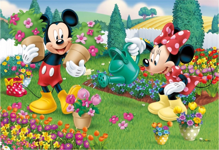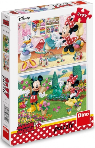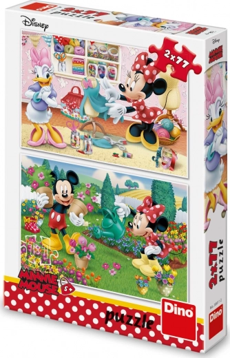 Deze set biedt 2 puzzels van elk 77 stukjes met de geliefde personages Minnie, Mickey en Daisy in vrolijke scènes vol bloemen en creativiteit. De stevige stukjes van hoogwaardig karton liggen goed in de hand en passen precies in elkaar, ideaal voor kinderen die geduld en handigheid oefenen.