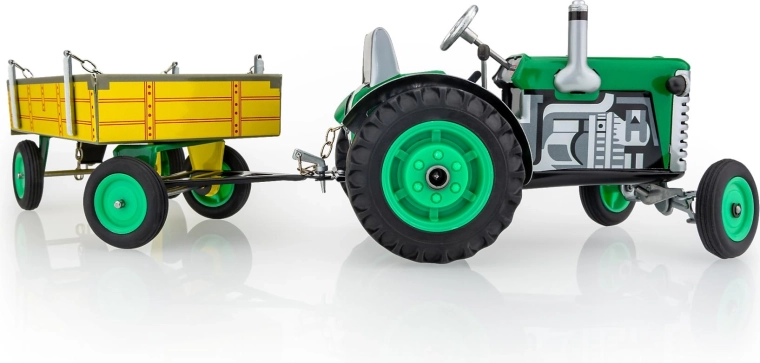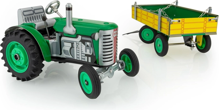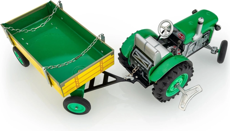 De metalen Zetor-tractor met aanhanger van het merk KOVAP maakt zowel kleine als grote fans van landbouwtechniek blij. De aandrijving wordt verzorgd door een opwindmechanisme met sleutel, met een werkende versnellingsbak met 3 versnellingen vooruit en achteruit, sturing via het stuur en een handrem. In schaal 1:25 en met een lengte van 28 cm biedt hij een authentieke rijervaring én verzamelwaarde.
