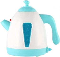 De waterkoker is ontworpen als een echt keukenapparaat met een elegante witte en turquoise kleurstelling.