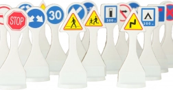 Een brede selectie van de meest gebruikte borden in verschillende vormen en kleuren stelt kinderen in staat realistische verkeerssituaties te creëren en spelenderwijs veilig te leren.