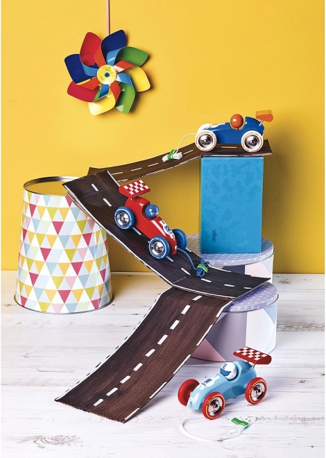 Schattig trekspeelgoed raceautootje van gelakt hout in turkooiskleur met een rode vleugel, ideaal voor kleine coureurs vanaf 18 maanden. Het ondersteunt balans en coördinatie, is gemaakt in Frankrijk en dankzij de compacte afmetingen van 16 × 9 × 9 cm nemen kinderen het gemakkelijk mee op elk avontuur.