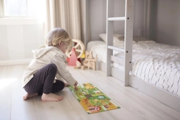Ontdek de wereld van de boerderij met een creatief set dat puzzelen en een leuk zoekspel combineert. Na het leggen van de lange puzzel volgen kinderen de paadjes met hun vinger, trainen ze de oog-handcoördinatie en zoeken ze ondertussen 20 objecten op de afbeelding. Ideale activiteit voor samen met kinderen of voor zelfstandig spel.