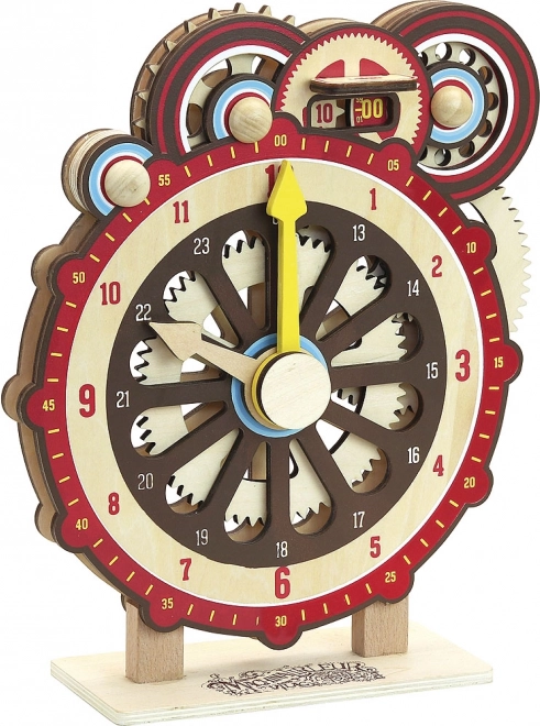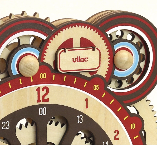De houten didactische klok van VILAC leidt kinderen op een speelse manier de wereld van tijd binnen. De analoge wijzerplaat wordt aangevuld met een schijfvormige nummerweergave die een digitale display nabootst en het oriënteren vergemakkelijkt. Beide wijzers en de nummerweergave zijn onderling verbonden met nauwkeurige tandwielen, waardoor de mechaniek trouw overeenkomt met een echte klok – dit helpt om de relatie tussen minuten en uren beter te begrijpen.