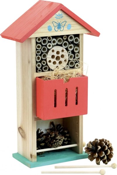 Vilac Insectenhotel rood is ontworpen om onderdak te bieden aan bijen, lieveheersbeestjes en andere nuttige insecten, wat helpt de biodiversiteit in je tuin te ondersteunen. De opbouw omvat buisvormige openingen en ruimte voor materialen zoals dennenappels, waardoor een ideale leefomgeving voor insecten ontstaat.