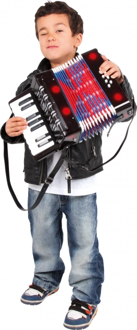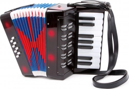 De accordeon is ontworpen als speelgoed voor kinderen vanaf 3 jaar – het stimuleert het gehoor, de coördinatie en ondersteunt de natuurlijke liefde voor muziek. Meer toetsen bieden ruimere mogelijkheden voor eenvoudige melodieën en leuke begeleidingen.