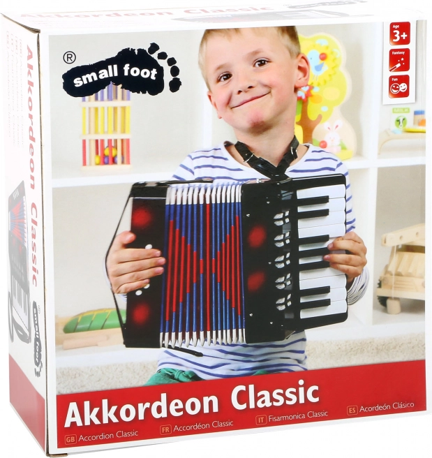 Ontdek de magie van muziek met de kinderaccordeon small foot Classic – ideaal voor de eerste muzikale stapjes. Dankzij de verstelbare schouderriemen is spelen comfortabel en kunnen kinderen zich volledig concentreren op ritme en melodie. De glanzende lakafwerking en meer toetsen stimuleren de fijne motoriek en creativiteit. Dit is geen muziekinstrument, maar een speelgoedartikel.