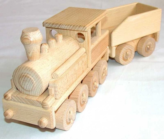 Dit houten model van een stoomlocomotief valt op door de precisieafwerking van beukenhout en het natuurlijke design dat slechts is benadrukt door waxen en polijsten. De locomotief heeft bewegende wieltjes en is ontworpen zonder scherpe randen, wat zorgt voor veilig spelen voor kinderen. Daardoor is hij niet alleen geschikt om thuis mee te spelen, maar ook in de zandbak.