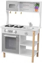 De stevige houten constructie kan dagelijks spel aan. De afneembare gootsteen maakt opruimen eenvoudig, en planken en haakjes houden alles overzichtelijk binnen handbereik.