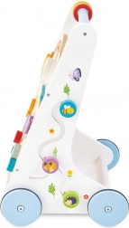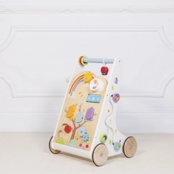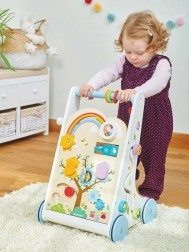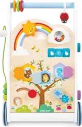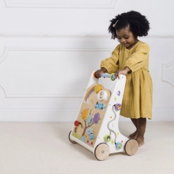 De loopwagen met twaalf interactieve elementen bevat alles van geïllustreerde dieren tot diverse texturen die de zintuigen stimuleren.