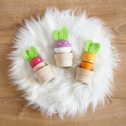 - 3 houten bloempotjes, groenten met verwisselbare delen (wortel, radijs, biet) met vilten blaadjes
