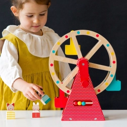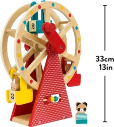 Het houten reuzenrad van PETIT COLLAGE is klaar voor direct speelplezier – het is voorgemonteerd en eenvoudig te bedienen met de soepele handslinger. Drie kleurrijke gondels vervoeren drie dierenfiguurtjes van beukenhout en stimuleren fantasie, tellen en het herkennen van kleuren en cijfers.