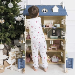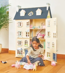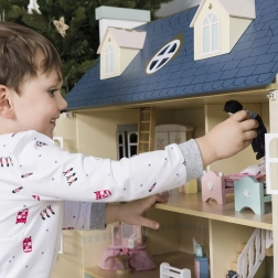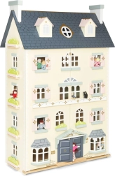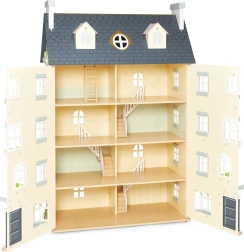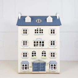 Het LE TOY VAN paleis-poppenhuis is een uitzonderlijk speelgoed en designstuk in één. Aan elke zijde zijn er talrijke ramen, waarvan sommige geopend kunnen worden, net als de prachtige voordeur in koningsblauw. Acht stijlvolle kamers zijn voorzien van elegante muurdecoraties en een grote centrale trap die tot de vierde verdieping reikt. Het afneembare dak onthult een ruime zolder die via een ladder toegankelijk is – ideaal voor fantasierijke speelscenario’s en als opberghoek.