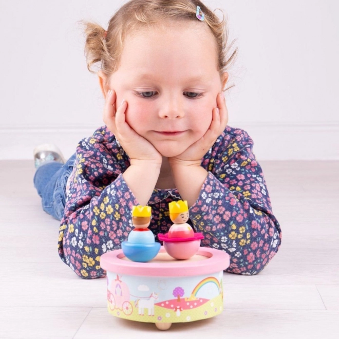Deze prachtige houten muziekdoos is uitgerust met twee figuurtjes die draaien en wiegen op het ritme van een wiegelied. De figuren zijn bevestigd met onzichtbare magneten, waardoor ze eenvoudig kunnen worden losgemaakt voor apart spel.