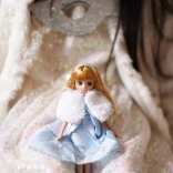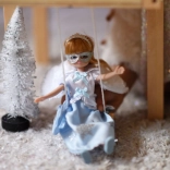 De pop is gekleed in een mooie blauwe jurk met ijzige details en zilveren sneeuwvlokken. Ze droomt van een magisch bal als Sneeuwkoningin.