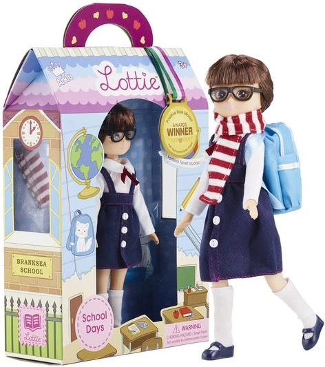 Lottie pop schoolmeisje met accessoires is een schattige, beweegbare pop van 18 cm die fantasiespel stimuleert en zelfvertrouwen opbouwt. Ze is gemaakt van veilig vinyl zonder ftalaten, heeft zachte nylon haren, kan zelfstandig staan, heeft afneembare schoenen en wordt geleverd met een rugzak, bril en kaartjes met leiderschapstips. Geschikt vanaf 3 jaar.