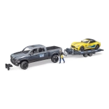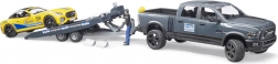 Geniet van actievol transport en een race-achtige sfeer met de gedetailleerde set van BRUDER: RAM terreinpick-up met aanhanger, gele sportwagen en chauffeurfiguurtje. Het model op schaal 1:16 biedt openende deuren, een afneembaar dak bij de sportwagen, besturing met een extra stuur en compatibiliteit met BWORLD-figuren voor nog meer speelmogelijkheden.