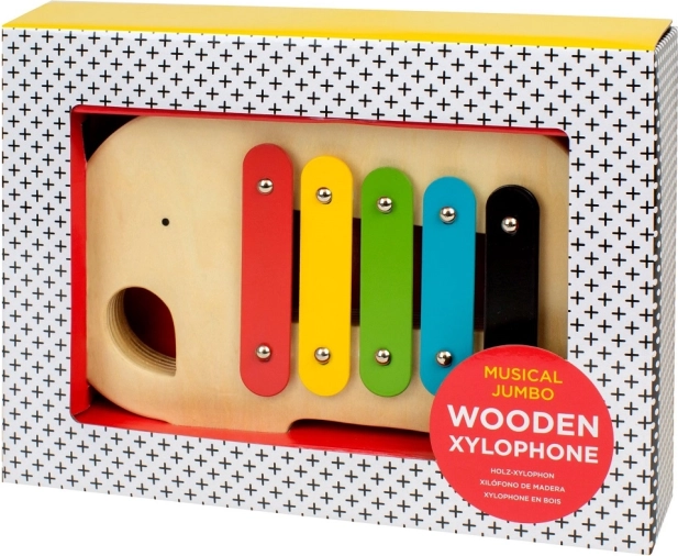 Vijf heldergekleurde metalen toetsen op een houten lichaam in de vorm van een olifant nodigen uit tot het ontdekken van tonen en de eerste speelervaringen. Inclusief houten stokje met elastische bevestiging.