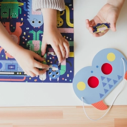 Na het leggen wacht er speurwerk op kleine detectives: vinden ze 5 snoepjes, 4 voorwerpen met wieltjes, 3 hoofddeksels, 2 muziekinstrumenten en 1 stinkend ding? Dankzij de hoogwaardige materialen van FSC-gecertificeerd papier en bedrukking met niet-giftige inkten is het spel veilig en milieuvriendelijk.