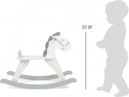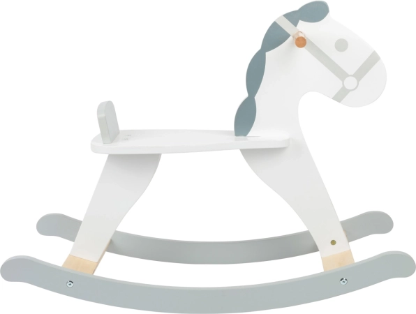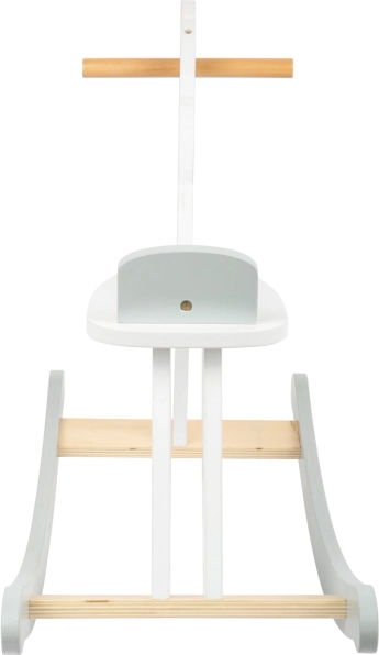 Klassiek hobbelpaard in moderne Scandinavische stijl, combineert wit en grijs, met een comfortabel zitje met rugleuning en een stevige houten constructie. Ideaal voor kinderen vanaf 2 jaar, ondersteunt de ontwikkeling van balans, coördinatie en zorgt voor langdurig speelplezier in elke kinderkamer.
