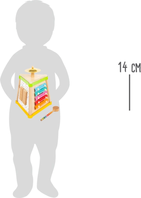 - Bevat 4 verschillende geluidsinstrumenten: een rammelaar, een mini xylofoon, een trommel en een klein bekken.