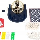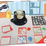 Deze complete Bingo-set bevat alles voor direct spel: een metalen lottrommel met slinger, genummerde balletjes, kaartjes en gekleurde fiches. Spelers markeren stap voor stap de getrokken nummers op hun kaarten, en wie als eerste een horizontale, verticale of diagonale rij van vijf vormt, roept “BINGO!”.