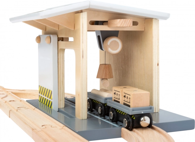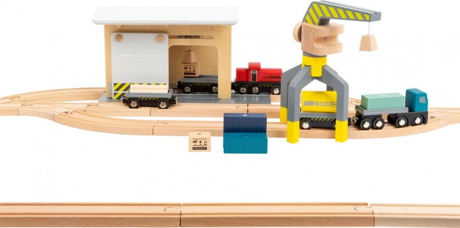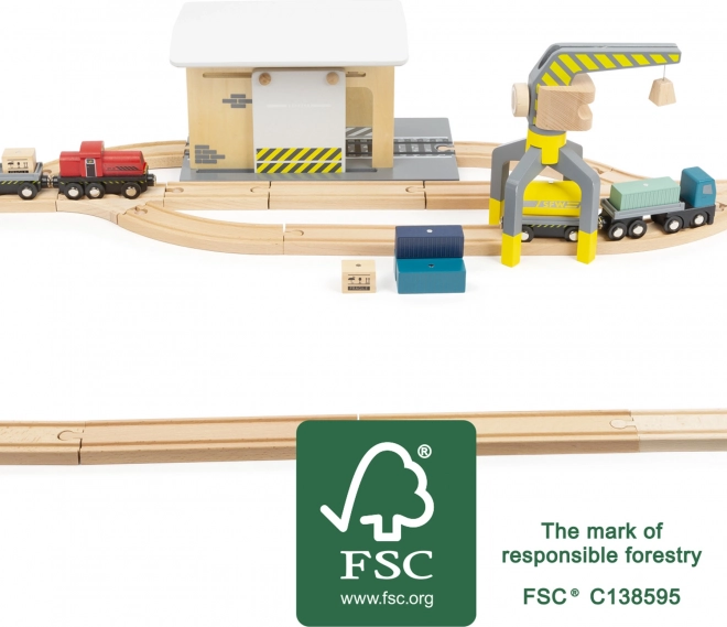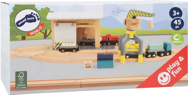 Ontdek een complete houten set voor een kleine spoorbaan, volledig compatibel met gangbare houten treinbanen. Kinderen beleven realistisch laden met de kraan, goederenvervoer en spel in het depot. De set bevat maar liefst 44 onderdelen, waaronder 25 railelementen, een 360° draaibare kraan, magnetische wagons en ladingen en een schuifwand met katrol. Gemaakt van 100% FSC-hout voor veilig en duurzaam speelplezier.