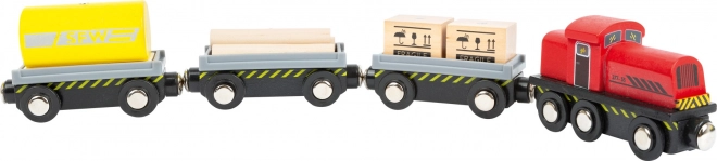 Bevat 25 raildelen, een locomotief met wagons en lading. De set laat zich eenvoudig koppelen aan de meeste houten treinbanen voor een nog grotere speelwereld.