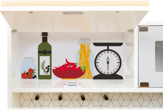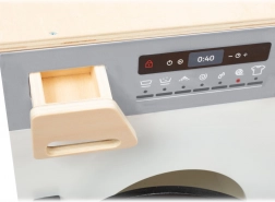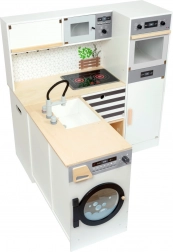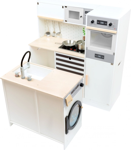 De keuken omvat een fornuis, oven, magnetron, koelkast en ruime opbergkastjes met deurtjes. Het eiland is uitgerust met een gootsteen, wasmachine en vaatwasser. In de set zit ook hoogwaardig metalen kookgerei voor direct speelplezier. Dankzij de robuuste materialen (hout, kunststof, metaal) is de keuken stabiel en duurzaam – ideaal voor dagelijks spelen door kinderen vanaf 3 jaar.