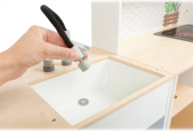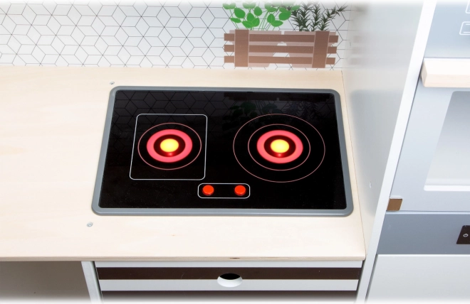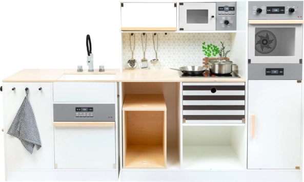Deze modulaire houten keuken XL SMALL FOOT is ontworpen voor creatief en realistisch spel. Je kunt haar opbouwen als een hoekkeuken (L‑vorm) of als een rechte keuken met functioneel eiland, zodat ze eenvoudig aan ruimte en speelstijl wordt aangepast. Draaiknoppen met klikgeluid en een kookplaat met LED‑licht en geluid (2x AA‑batterijen, niet inbegrepen) zorgen voor een authentieke kookervaring.