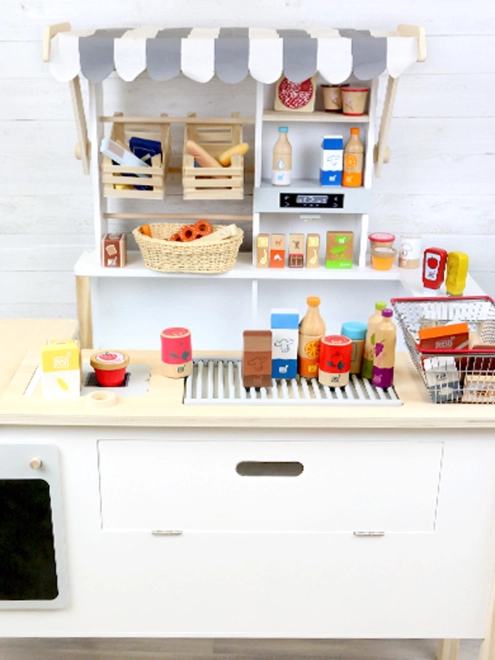 Perfecte aanvulling op de kinderkeuken of het winkeltje: kinderen kunnen “verkopen”, “serveren” en “proeven”, hun woordenschat, sociale vaardigheden en fantasie ontwikkelen. Hoogwaardige houten afwerking met gladde randen zorgt voor een lange levensduur en veilig gebruik.