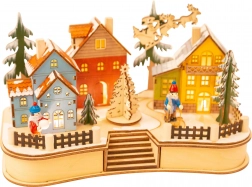 Dit zorgvuldig vervaardigde houten winterdorp brengt gezellig licht en een sprookjesachtige sfeer in elk interieur. Dankzij de indirecte verlichting komen de gedetailleerde uitsnijdingen van huisjes, boompjes en winterse scènes prachtig tot hun recht. Na het inschakelen begint bovendien de boom in het midden van het dorp te draaien, wat de decoratie een levendig, feestelijk effect geeft.