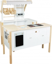 Ontdek een creatieve wereld met onze multifunctionele stand, ontworpen voor de speelse verbeelding van kinderen. De veranderlijke constructie maakt een gemakkelijke transformatie mogelijk van een verkoopstand naar een keuken of café in een handomdraai. Multifunctionaliteit in deze stand omvat een weegschaal, kantelbare planken, tekenborden en zelfs een koffiezetapparaat met opbergruimte inclusief twee bakken. Een geweldige aanvulling is de variabele luifel, die gemakkelijk kan worden neergeklapt om ruimte te besparen.