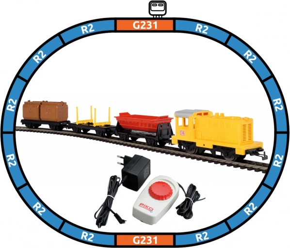 - DB-diesellocomotief (1×), DB-goederenwagens (3×), bochten R2 55212 (12×), rechte rails G231 55201 (2×), voedingsklem 55270 (1×), analoge regelaar met voeding 55003 (1×)