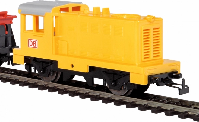 De gele diesellocomotief met eenvoudige analoge besturing is robuust en betrouwbaar, geschikt voor dagelijks spelen.