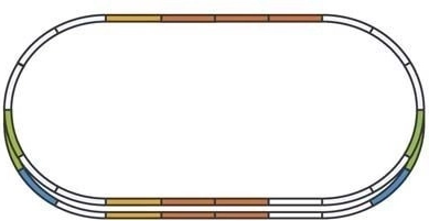 Set E breidt de basisbaan uit met een parallel recht traject en twee boogwissels, ideaal voor inhalen en gevarieerder bedrijf.