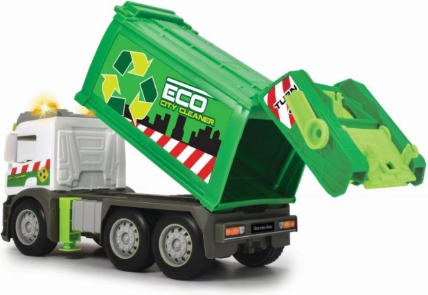 Ontdek stedelijk opruimen met de stijlvolle Mercedes vuilniswagen. Kinderen zullen de realistische afwerking met functionele lichten en geluiden geweldig vinden, die de spelbeleving versterken. De kiepbare laadbak en meegeleverde container maken het mogelijk om ‘afval’ te laden en te lossen zoals in het echt.