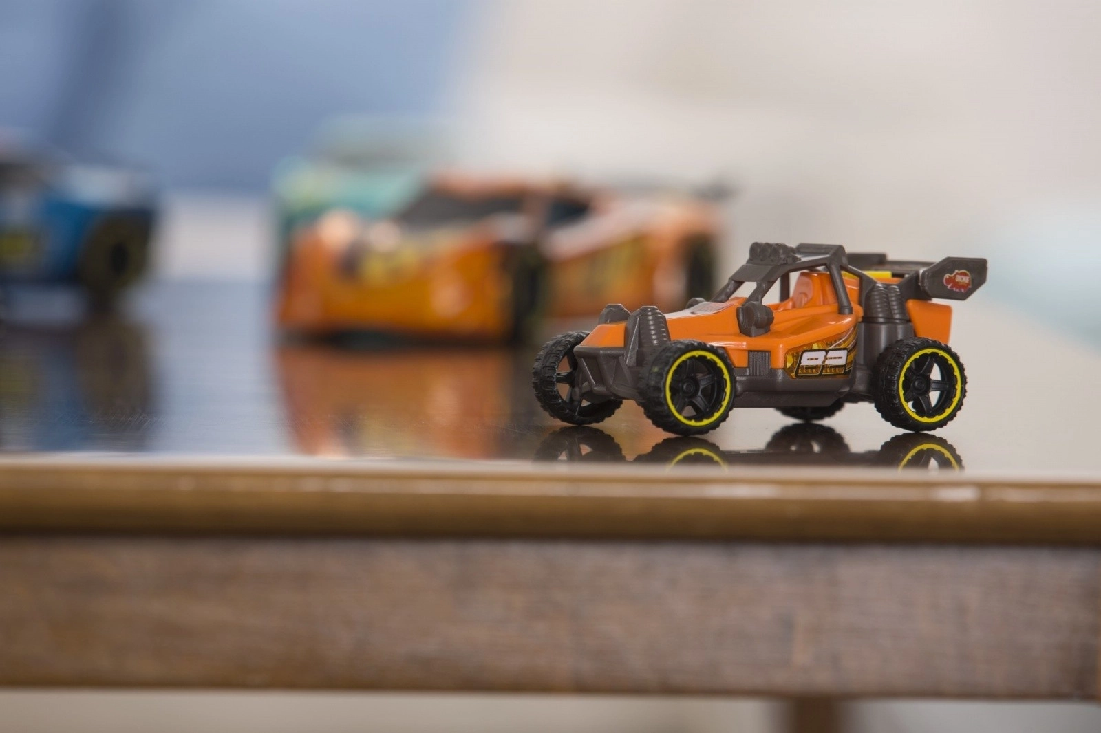 De autootjes rijden soepel zonder opwinden of motor – een klein duwtje is genoeg en de race kan beginnen.