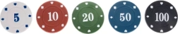 Kleurige fiches met waardes 5–100 en een prettig gewicht van ca. 4 g laten zich uitstekend schudden en geven een authentiek spelgevoel.